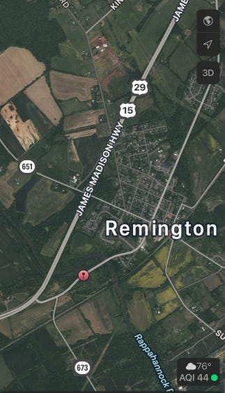 The town of Remington (2025 population of 658 souls) is a short distance away across the Rappahannock River. It is a very rural area with few nearby houses and other infrastructure. Here is an aerial view of courtesy Google Earth.