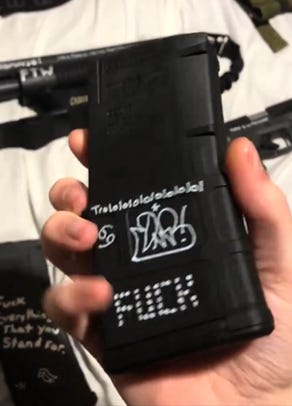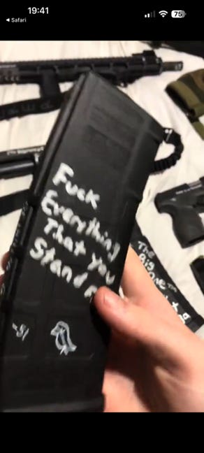 Westman did not worship or honor God but he did honor murderers. The edge side of one of his magazines pictured below had six names written on it. Matt Van Swol points out on X that they are the names of other mass shooters from the U.S. (Sandy Hook school, Aurora Colorado movie theater, and University of Texas tower), and schools in Canada, Crimea, and Finland.