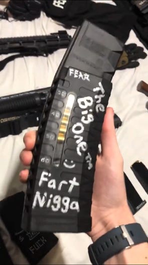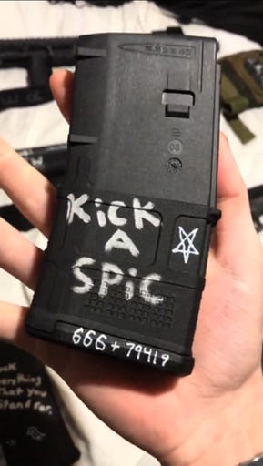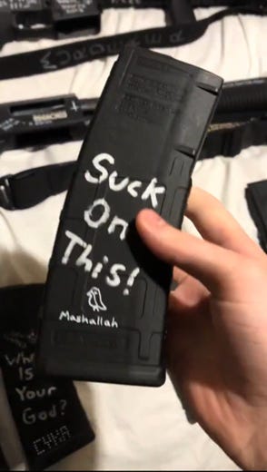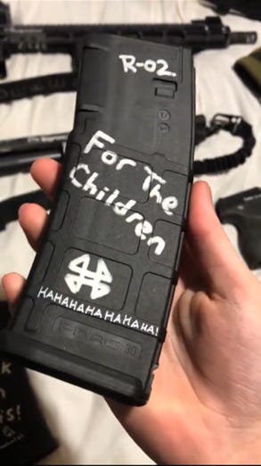 As you can see below, he scrawled his “philosophy” on his firearms and magazines. In addition to those you can see in the screen shots below, here are some of his profundities with some explanatory notes, and with my apologies for subjecting you to this vile trash: